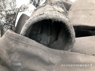 除塵器(qì)使用地點(diǎn):寧夏石(shí)嘴山,除(chú)塵濾袋使用壽命:3年,除塵濾袋規格:500g滌綸針(zhēn)刺(cì)氈,粉(fěn)塵(chén)類型(xíng):黑砂,粉塵特性:粗粉塵、濕度大,幹燥時會變(biàn)成固體並粉碎,工作溫(wēn)度:低於60℃除塵器(qì)吸風口處有(yǒu)一個除塵濾袋在袋口損壞,濾布完全成了黑色(sè),由於缺少一個濾袋