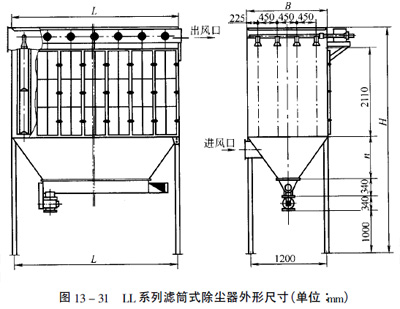 LL係列濾芯除塵(chén)器主要外形尺寸(cùn)及安裝尺寸見圖13—31和表13—22。