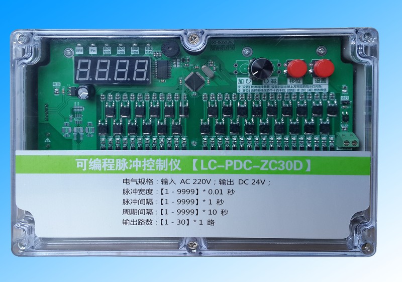脈衝袋式除塵器控製儀 LC-PDC-ZC30D (在線式 30路 24V),此款控製儀電壓有24V和220V兩款,購買時請告知客服選用電壓,以免為您造成不必要的損失。此款脈(mò)衝控製儀(yí)輸出路數可調,凡(fán)是所控脈(mò)衝閥數量為30個以下(xià),全部(bù)可以使用。