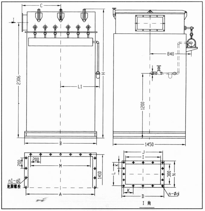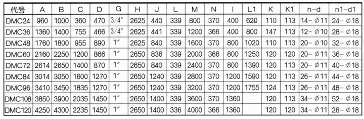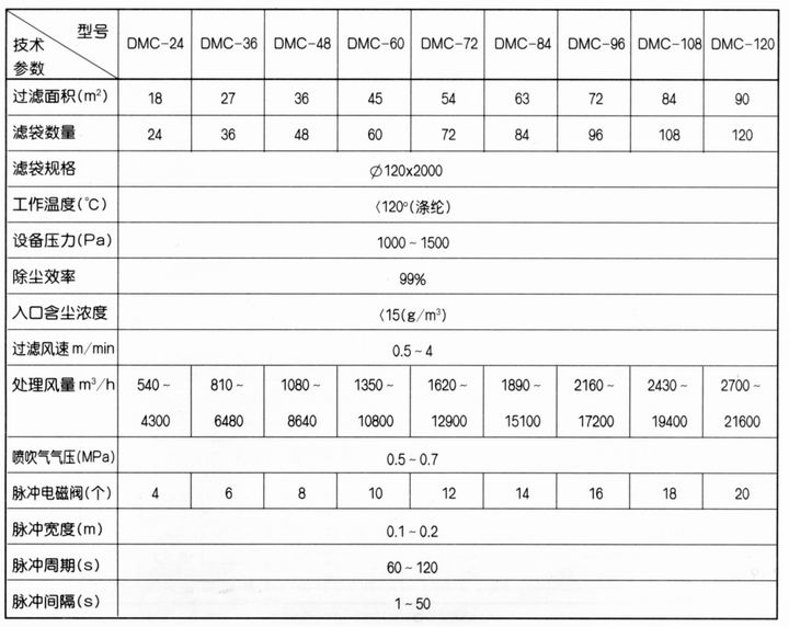 DMC型脈衝袋式倉頂除塵器主要技(jì)術參數見表,在選型時(shí)應注意入口粉塵濃度,在技術(shù)性能上,透過濾(lǜ)袋的氣流速度(即過濾風速)與氣(qì)體含塵濃度成反比,因此在確定過濾麵積時,還須滿足濾袋的聚塵(chén)能力(即兩次清灰(huī)期間濾袋單位麵積上最大允許積塵數量),一般聚塵能力不大(dà)於400克/m2,可按下(xià)式計算: