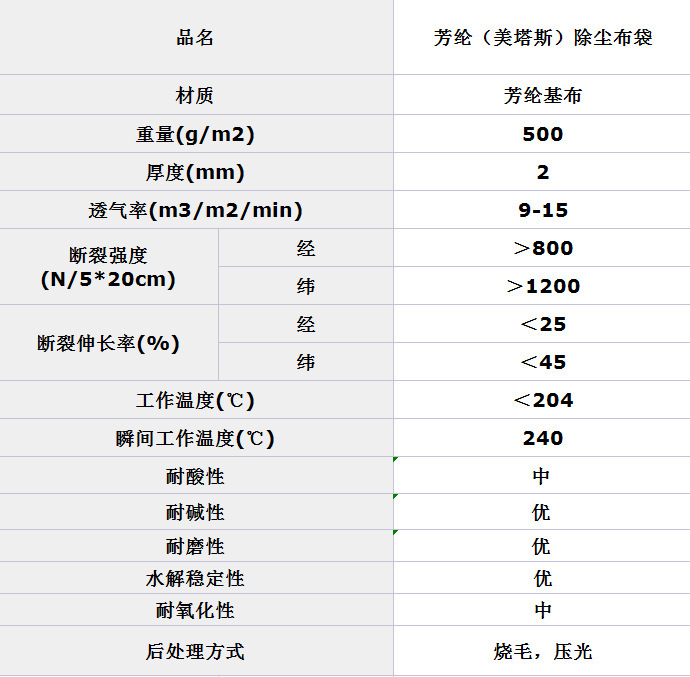 瀝青攪拌站美塔斯除塵布(bù)袋可在204度下連續使用,並可承受反複的250度瞬時波(bō)動溫度,尺寸穩定性好(250度時熱收縮率1%),防火性能好,400度時才分(fèn)解碳化,不自燃也不助燃(rán),低濃度的酸堿和大多數碳氫化合物對它(tā)無影響,良好的化學性,適用於瀝青(qīng)混凝土攪拌瀝